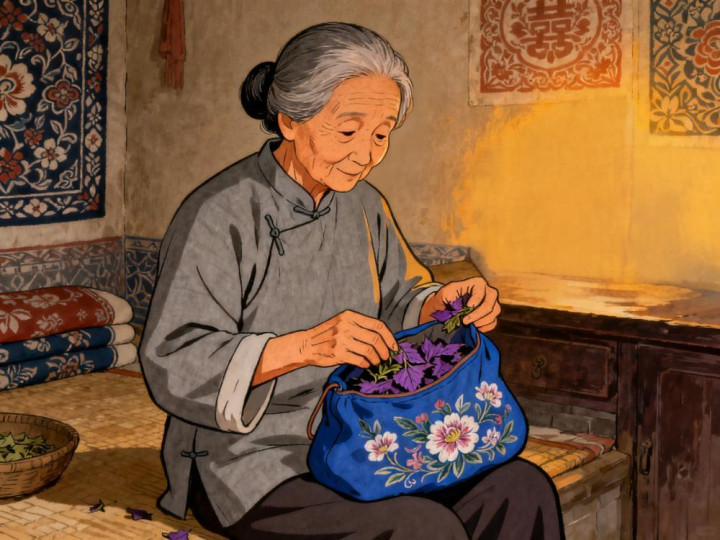 陈阿婆一听,叹了口气,拍了拍大腿:“唉,问题就出在这儿!你跟我来。” 她起身走进里屋,从柜子里拿出一个小布包,布包是深蓝色的,上面绣着一朵小小的菊花,是老伴儿生前给她绣的。她打开布包,里面是一些晒干的紫苏叶,递给年轻人:“你把这个布包里的紫苏叶和剩下的那剂药一起煎,这次煎好药后,药渣别倒在槐树下,找个没人的地方,埋到土里去,记得埋深点,别让野狗刨出来。”