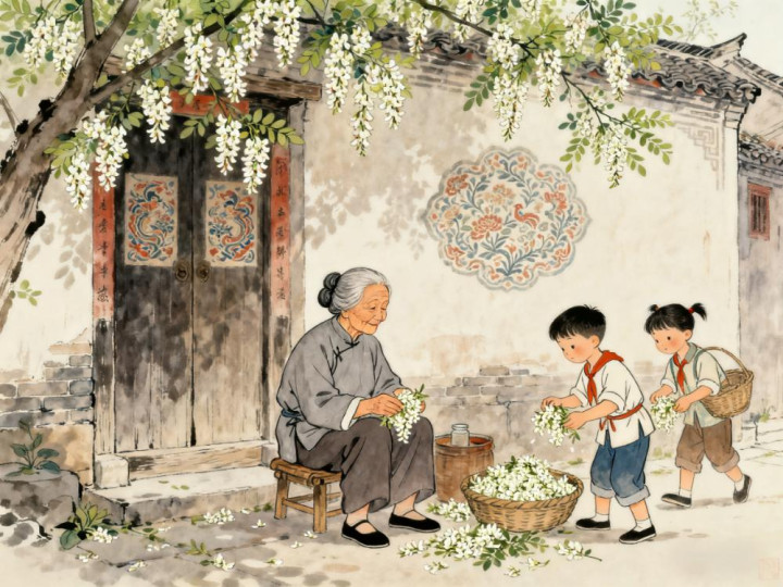 街坊们路过药铺,总会停下脚步,闻闻这香气,和陈阿婆聊几句。孩子们则喜欢在槐树下捡槐花,有的捡来玩,有的则会送给陈阿婆,说:“阿婆,给您槐花,可香了。” 陈阿婆就会笑着收下,放在窗台上,让药铺里的香气更浓些。